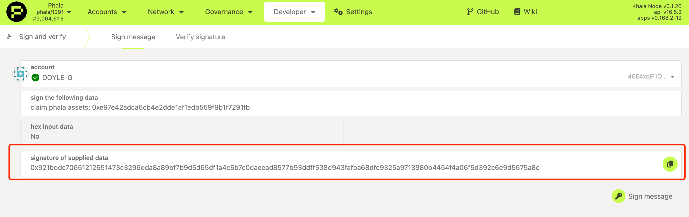 - Copy this signature and store it safely — you will need to send it to the Phala team.