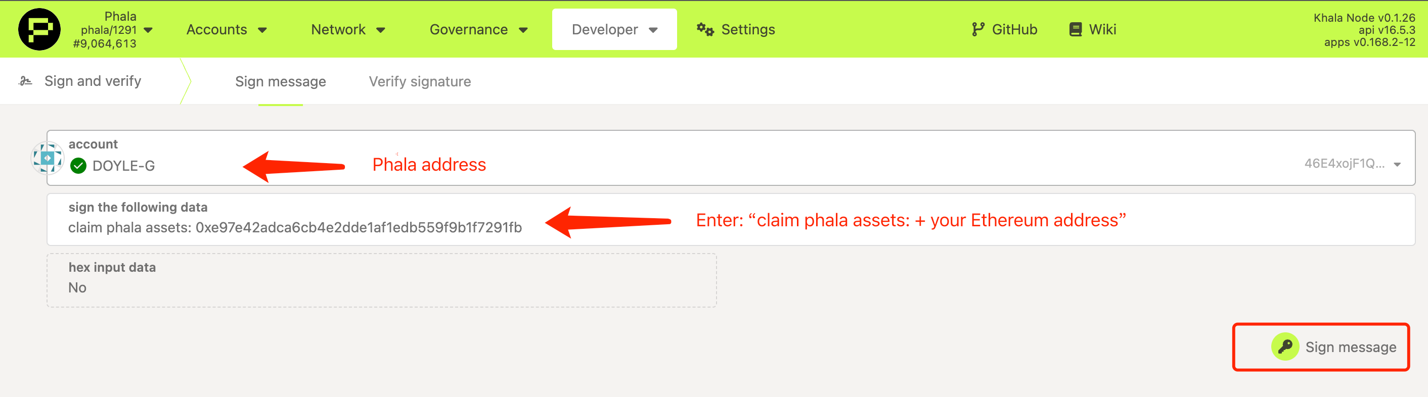 - In the message field, enter your Ethereum address (the address where you want to receive PHA on Ethereum). Please do enter “claim phala assets:” before your ethereum address